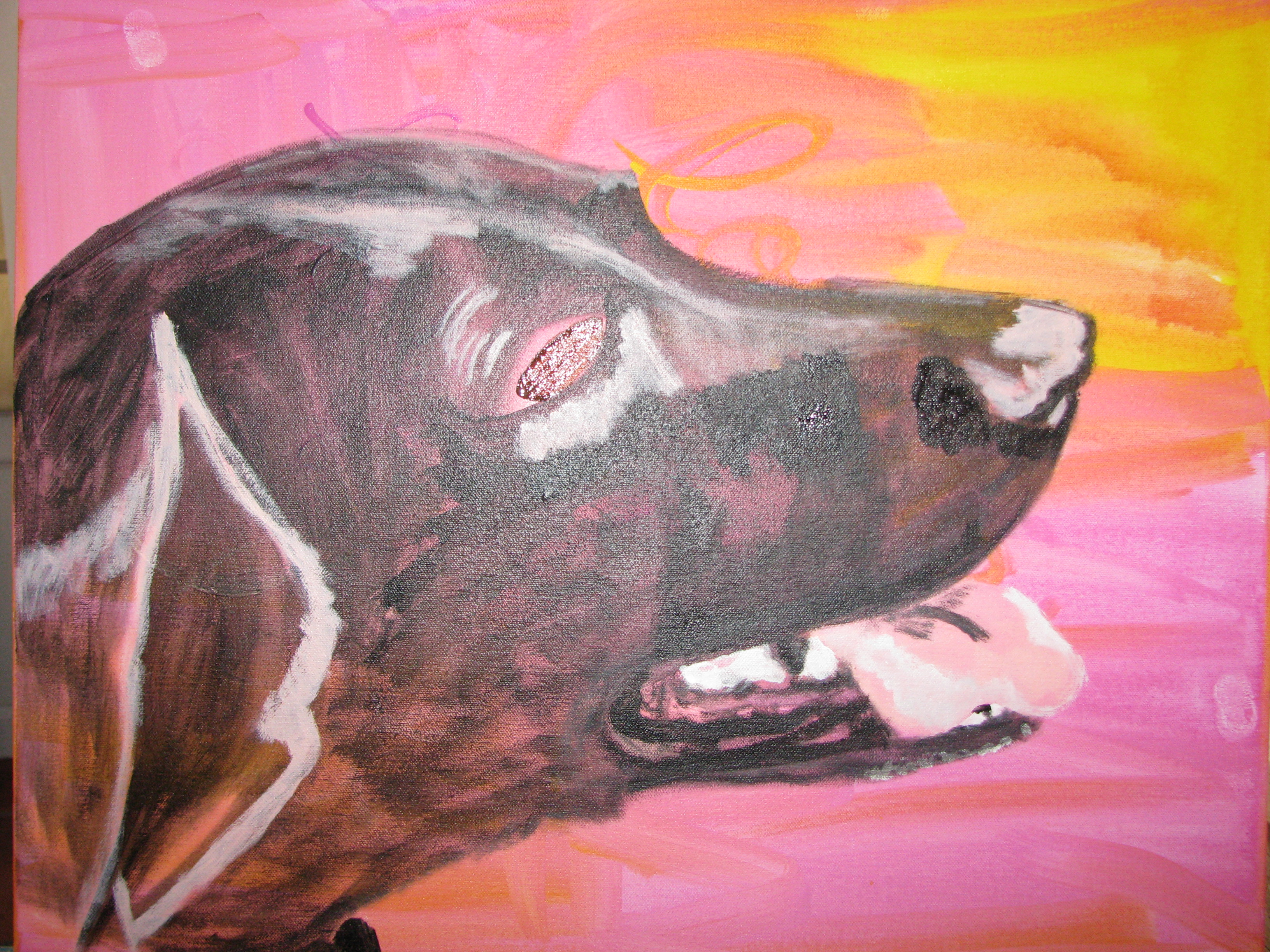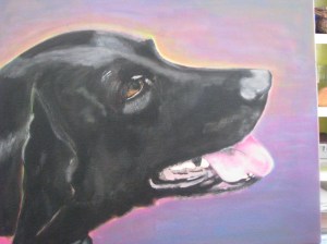 Here she is almost done. I like the light in her eye, but her tongue is too large and the light on her nose is too white. I painted white over some of her tongue and blended it into the background to sort of start over.