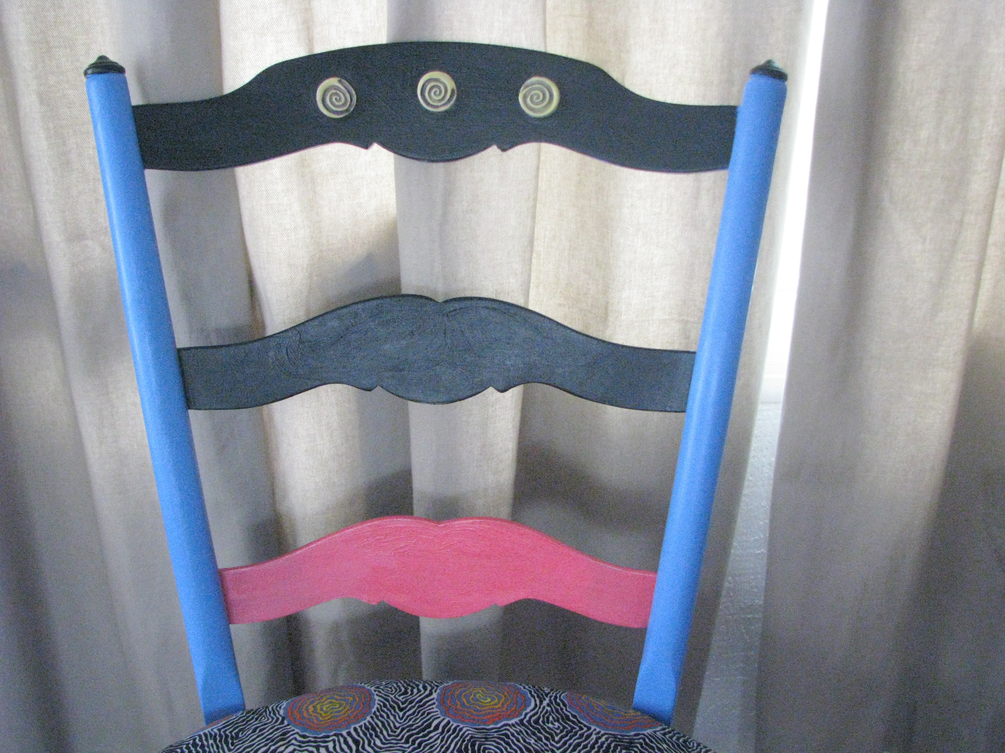 Mini Mags helped me with this next chair. I painted the chair blue and put the cool material on it. Then I painted lips and mustaches on the chair back. I didn’t like it and painted the mustaches away with my trusty white paint. Maggie and I decided on black and pinkish. (She always says pink.) While I was explaining that we needed to do something that would go with the material, she walked over to my shelves and picked up 3 clay pieces that my sister, Jan, just sent to me in our Christmas box. I didn’t even know MMMM looked on the shelves. They were perfect. Now I love the chair.