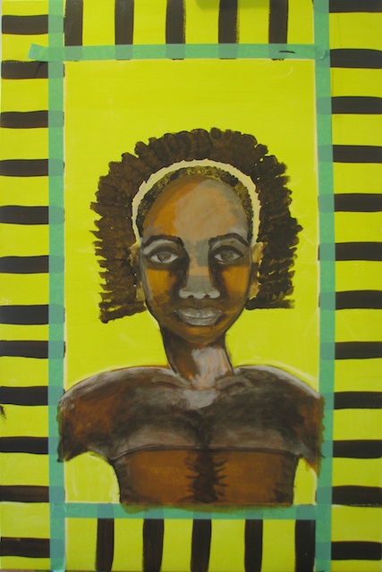 I don’t think I used any cool painting techniques that I haven’t written about before. This is the first time I painted a border on the canvas. I knew what I was painting when my hands touched the canvas, but not before. She wanted to wear all red, and not have any red elsewhere on the painting.
