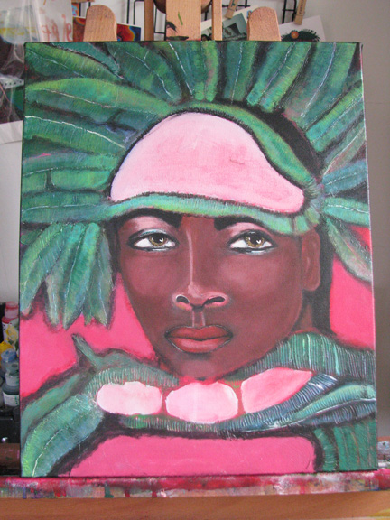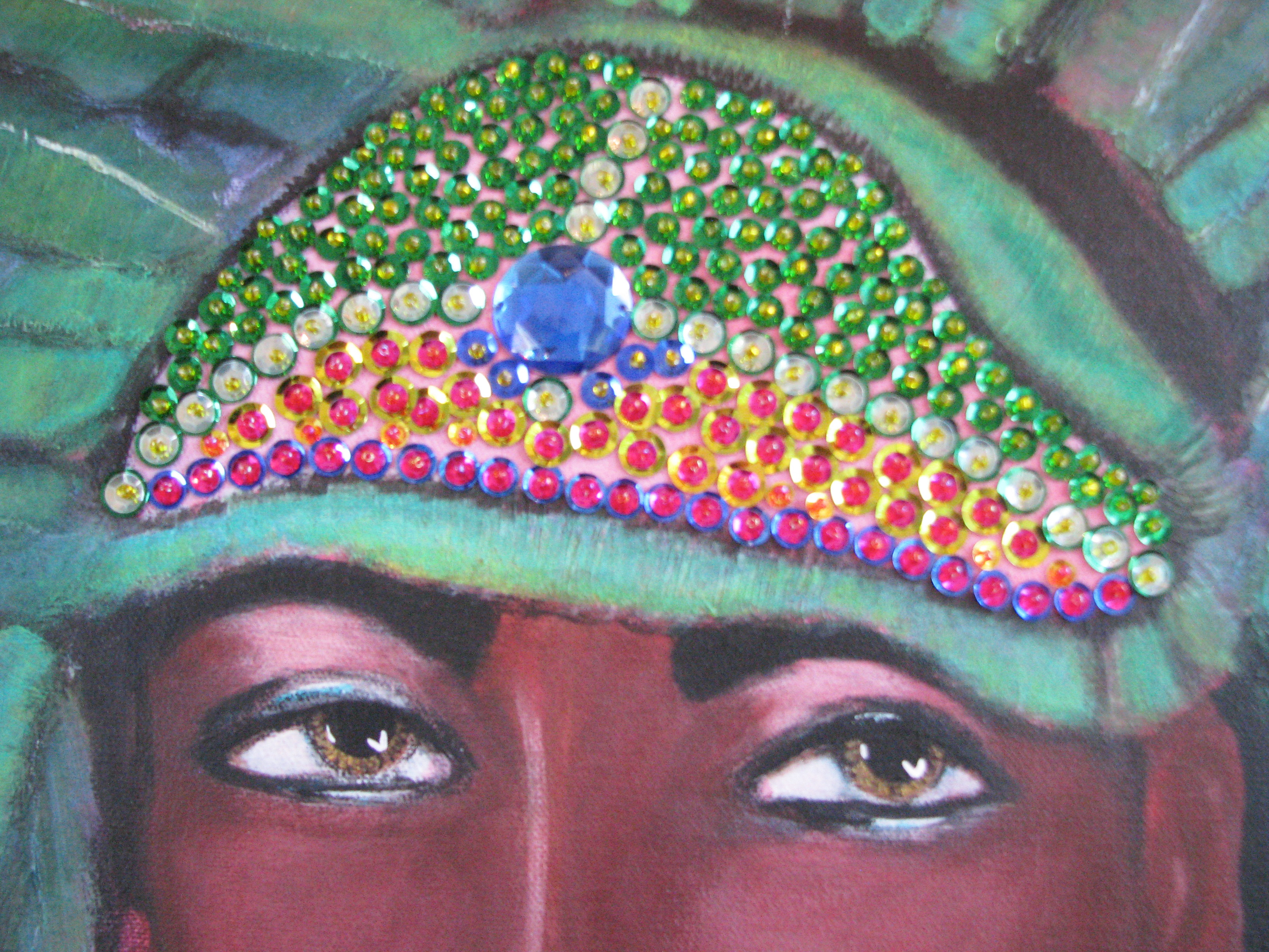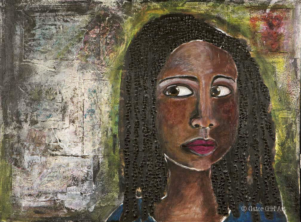 I enjoyed painting a giclee’ more than I thought I would. The same woman who bought the original of Feathered Friends asked me to embellish a giclee’ of Expecting Grace. She asked for bubble paper on the hair and pieces of paper in the background like the original.