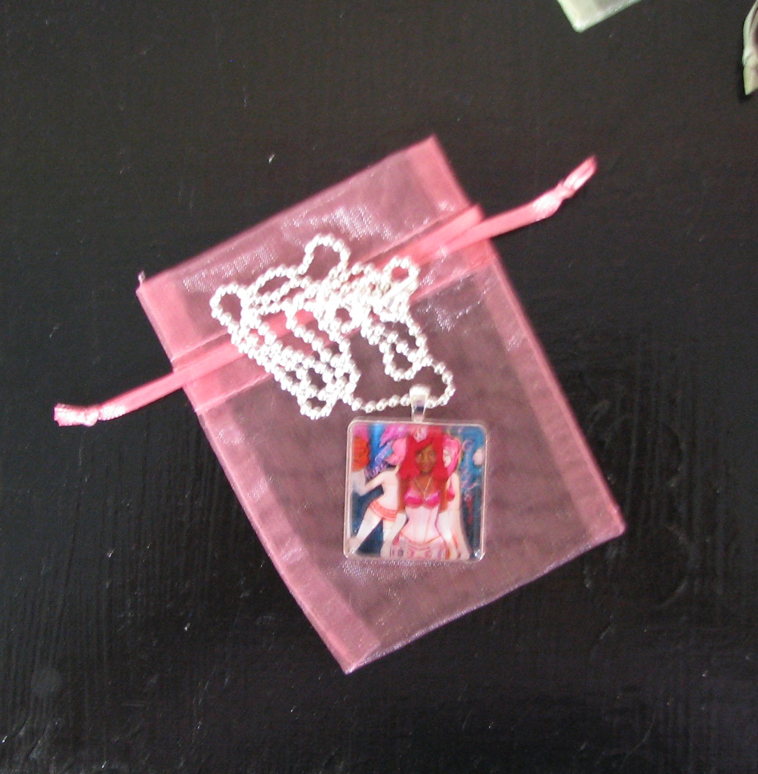 I cannot get a picture that looks clear. The necklaces are small prints (30 mm square/ 1.18 inches) of my art. 19/52 of the original paintings made into necklaces. I have been selling necklaces out of my studio and at festivals for $20. A few Pussyfooters have asked for them. This is why I decided to put them on-line. They are easy to put in a padded envelope and stick in the mail.