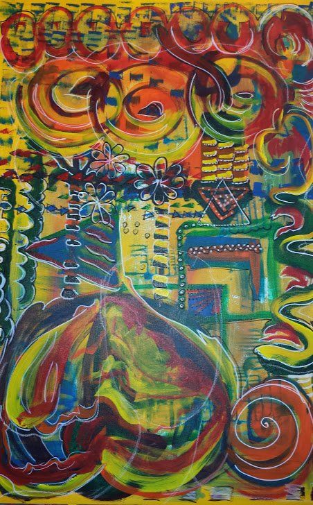 When I got back into the studio, I felt like playing with art. I painted a few layers of abstract strokes and my favorite symbols. The key to playing with paint like this is to stick with the same temperature of colors in each layer and let the layer dry before the next layer.