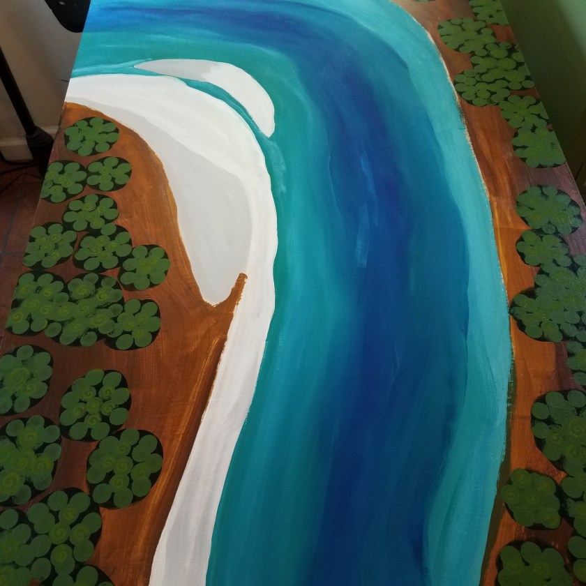 The porch table at the camp is finally damaged so much that we need a table cloth to play cards. I had a piece of wood left over from a project that is too heavy to hang on the wall. It was just the right size to replace the damaged table.