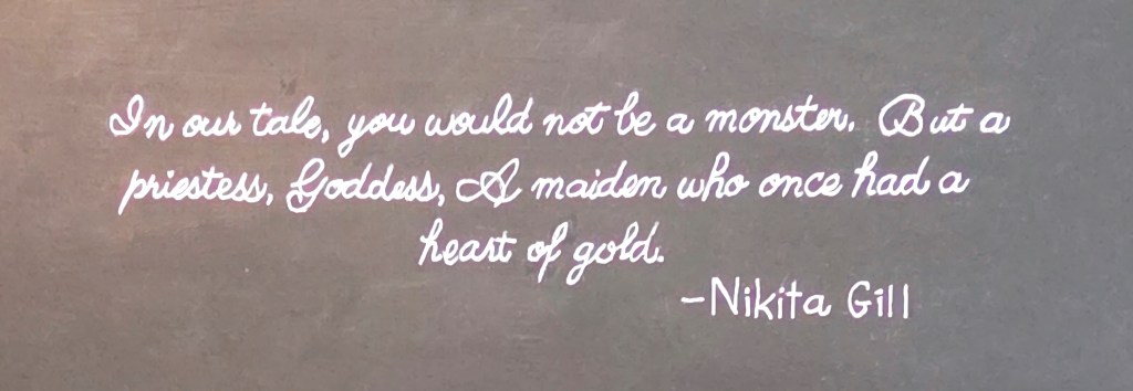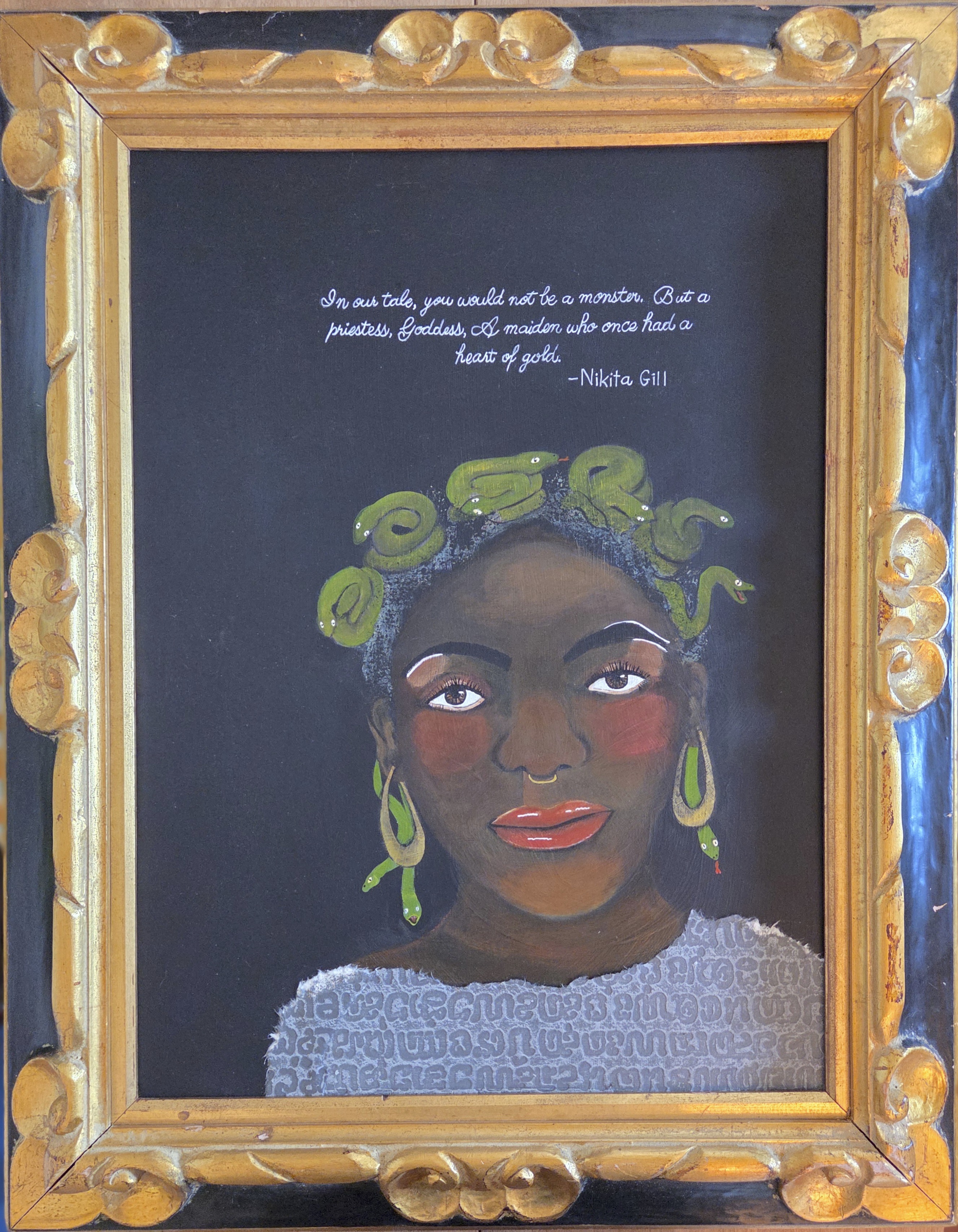 I have been working on Medusa for a few weeks. It has been cathartic to paint Medusa with the repealing of women’s rights in the US right now. As usual, when I paint something I know little about, I Google it. I also watch YouTube clips and read what’s written about it. Not a huge deep dive because I have a shortish attention span. While I was looking up Medusa, I saw what other people had painted and didn’t see my idea. That’s a win. I also found a poem by Nikita Gill that I love.
