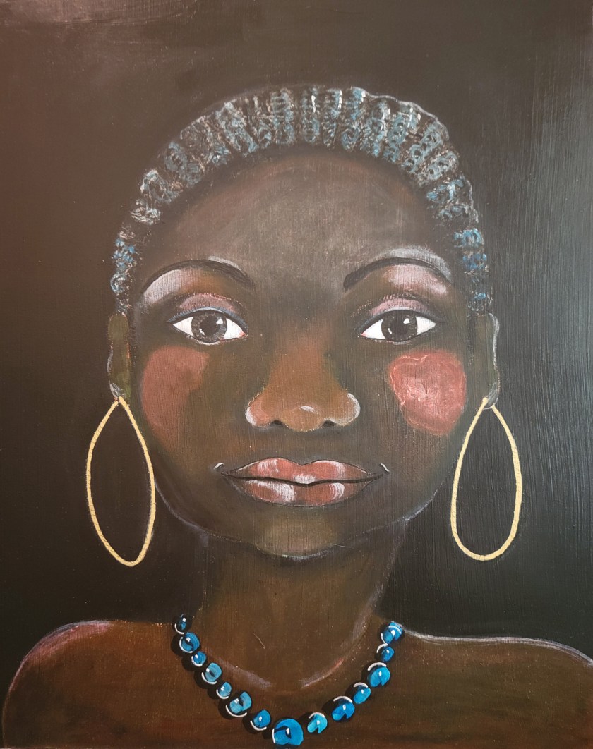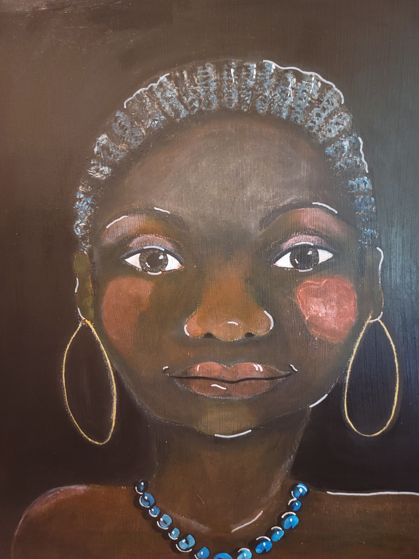 I have 2 of these frames. My mother got them at an estate sale or garage sale, maybe 40 years ago. I finally decided I could use them. Blick Art Materials had the perfect size board. I thought that would be best to use because it is hard wood, smooth and not cut crooked. Painting on wood is different than canvas. One of the pros of using wood is that I can write with a regular ink pen. One of the cons for me was that I wasn’t used to painting on wood. When I figured out to just lay the paint on instead of scrubbing several layers on, it worked like a dream. Kind of like a dream. It took quite a long time and I don’t think her face is exactly like I pictured. Her expression is for sure what I had in mind. She looks to me like she knows so much about life and just deals with it. Skeptical for good reason.
