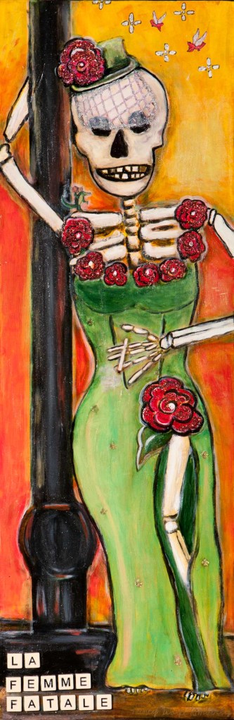 La Femme Fatal is mixed media, 12 x 36 inches painted on wood. She is standing on the street in the French Quarter after the parades have passed. She still has “it” after all these years. She sells for $800.