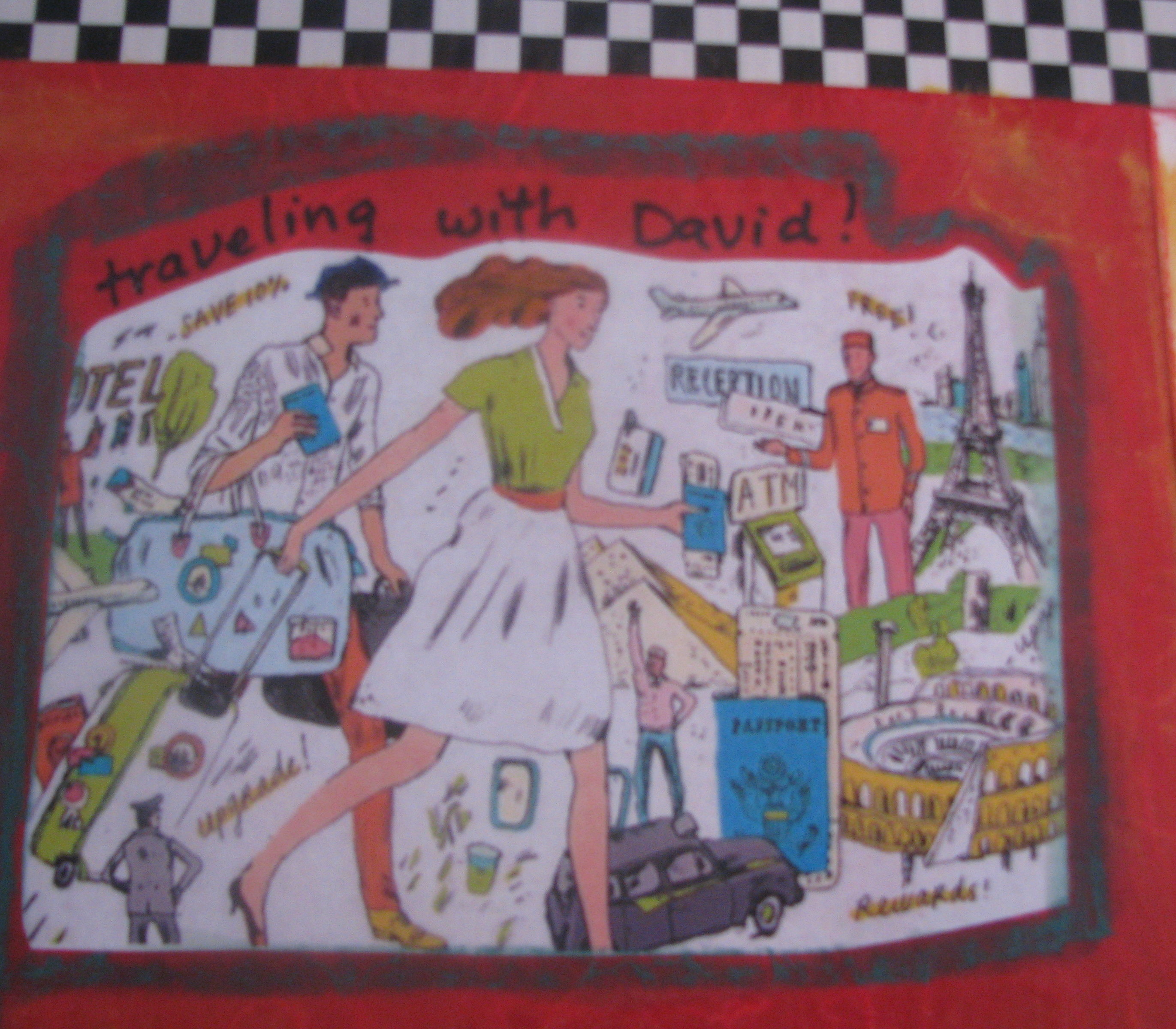 I drew a hat on David, because the picture had too much hair. I like this picture, because I have a rolling suitcase and David is carrying his. That is just how we like to do it. The picture has so many places to see!