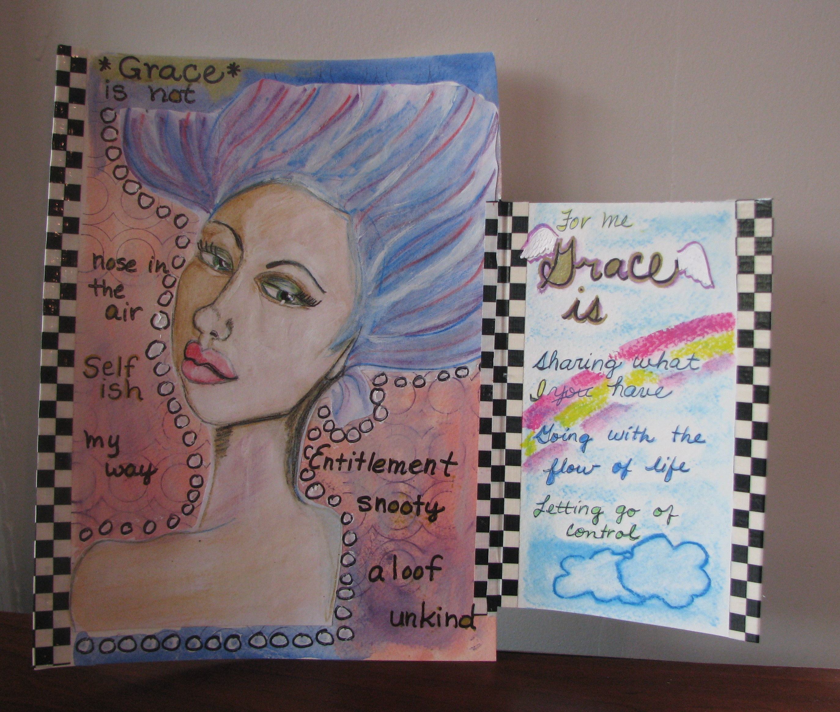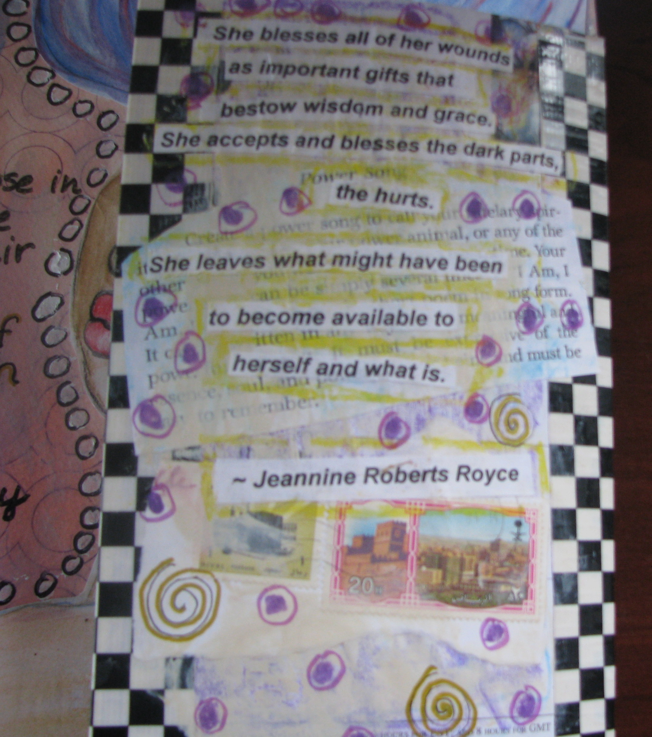 I layered the back page with prayers. I love to put a lot of intent into the page. I put some stamps that my Aunt Ruth gave me because at 93 she is still full of grace and remembers everyone with cards.