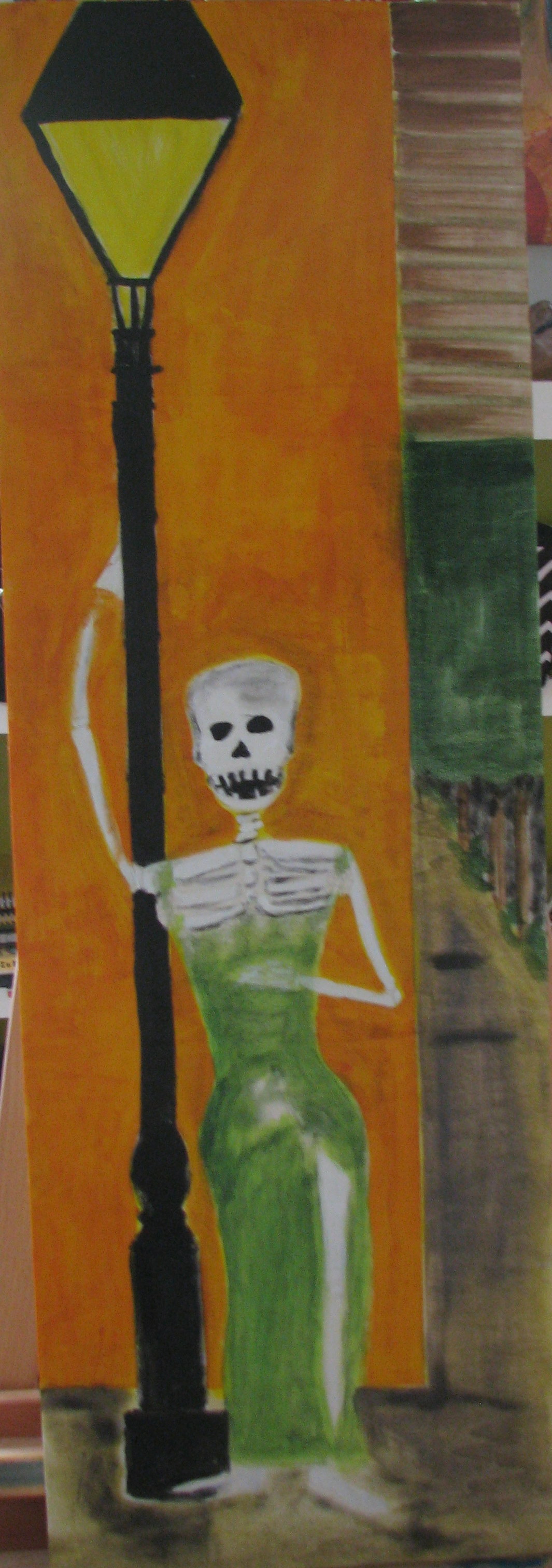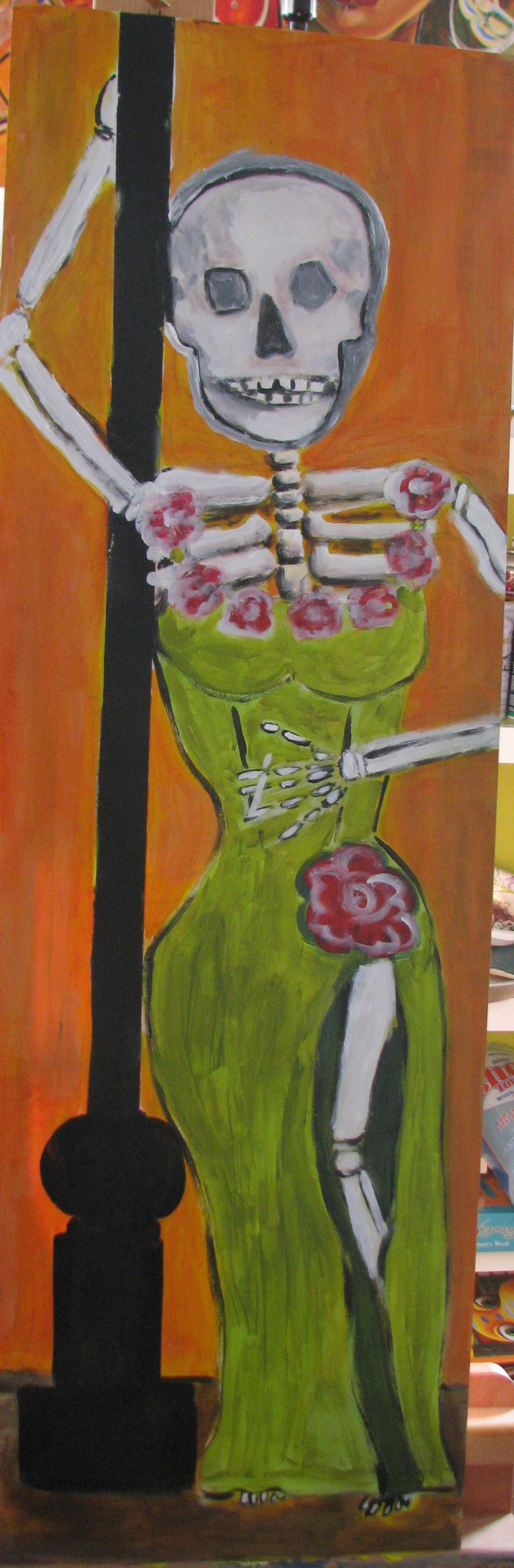 What I am sharing this week is the progression of 2 paintings that I am working on. You will have to use your imagination about what they are going to look like when I am finished or check in next week when I am done. The skeleton is finally coming along. I am going to call her La Femme Fatale. I went through a lot of names. I think it was because I started painting what I had in mind, but forgot to check in with her. A couple of names that she had for a while were Lasting Beauty and Haunting Beauty. Maggie wanted to name her “A field of Unicorns”. Apparently, the unicorns were invisible. I like La Femme Fatale because New Orleans has such a French influence and She is hanging out in the French Quarter around Mardi Gras. She is pretty fatale being beyond the flesh and blood stage of her life.