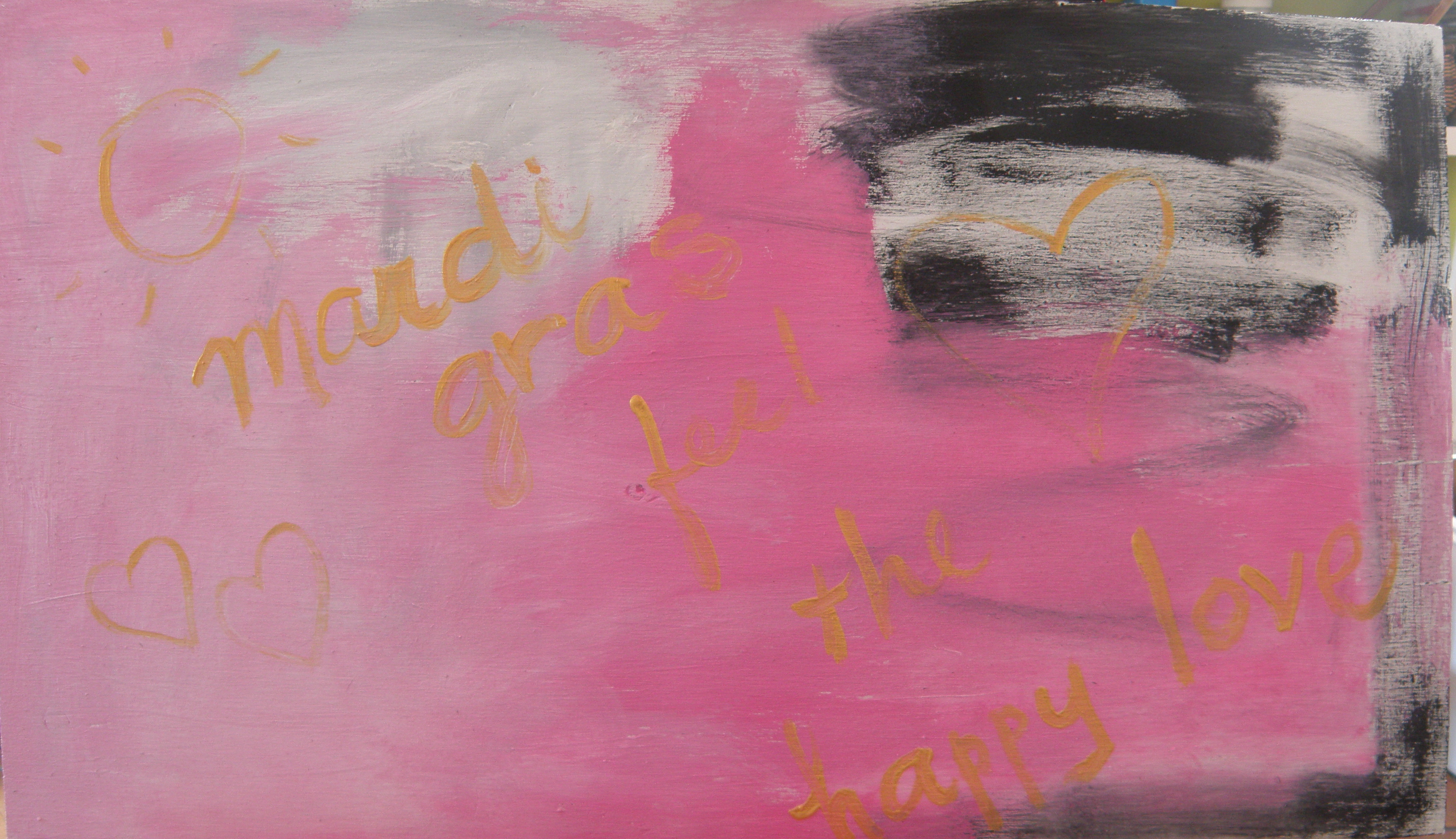 I picked 3 colors: mars black, magenta and white. I painted these words on in gold: Mardi Gras feel the happy love. I added a big heart on the right and 2 little hearts on the left.